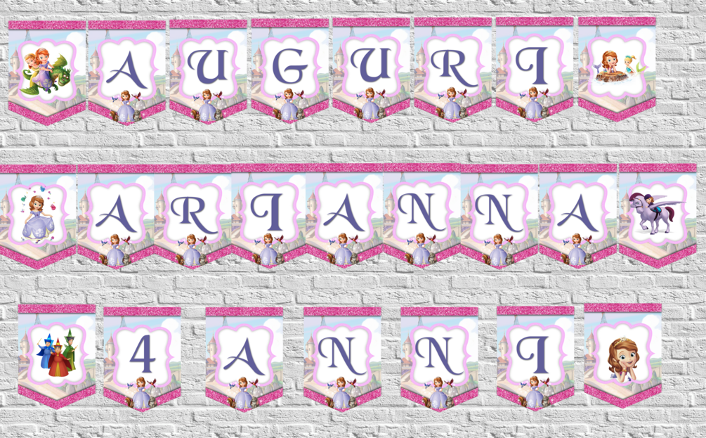 Festone "AUGURI" da stampare e appendere in tema Principessa Sofia per la festa di compleanno della tua bambina.